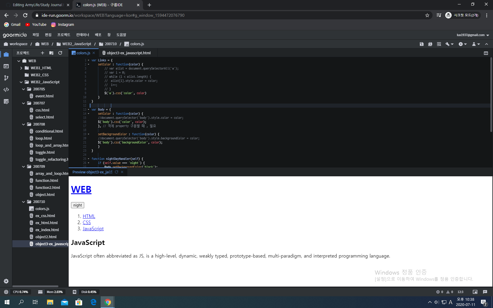두 개의 Web2 수업 모두 Web1때와 마찬가지로 구름 IDE를 활용했고, 강의를 들으며 직접 실습을 해보는 방식으로 진행했다. 실습을 하며 짠 코드들은 왼쪽 프로젝트 탭에서 볼 수 있듯이 날짜별로 폴더를 만들어 정리해 두었다.