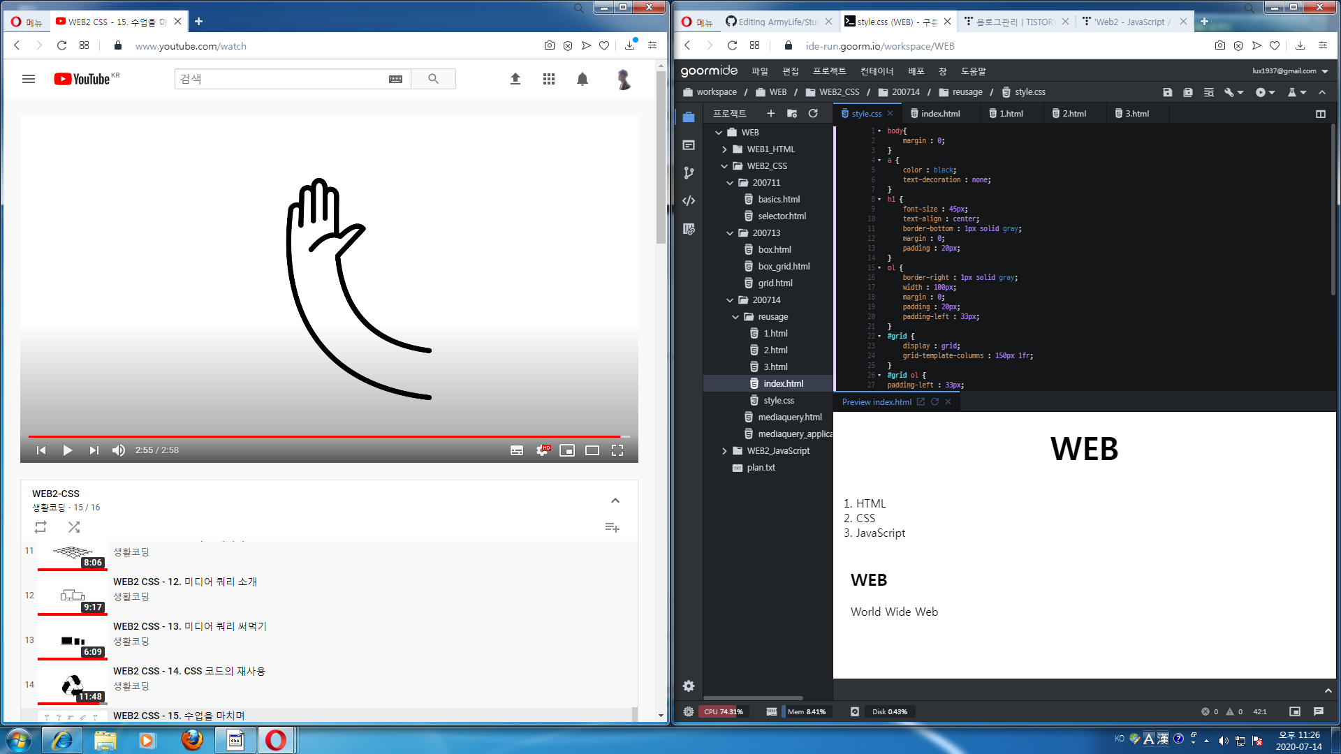 다음 강의로는 Web2 - CSS를 선택했다. 장기적 목표였던 React Native를 위해 바로 JavaScript와 연계되는 Node.js 수업과 React 수업으로 넘어가고 싶었기도 했지만, 웹 프로그래밍에도 꽤 흥미가 생겨 더 알아보고 싶었기 때문이다.