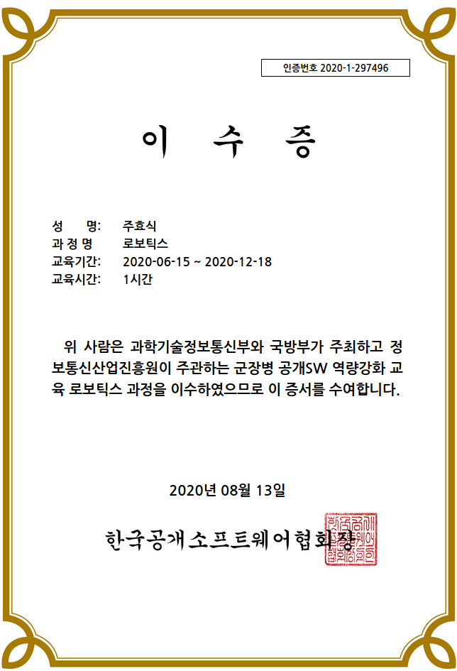 | 국방오픈소스아카데미 - 2020 군장병 공개SW 역량강화교육, 그 도전을 마치며 (0) | 2020.08.30 |
