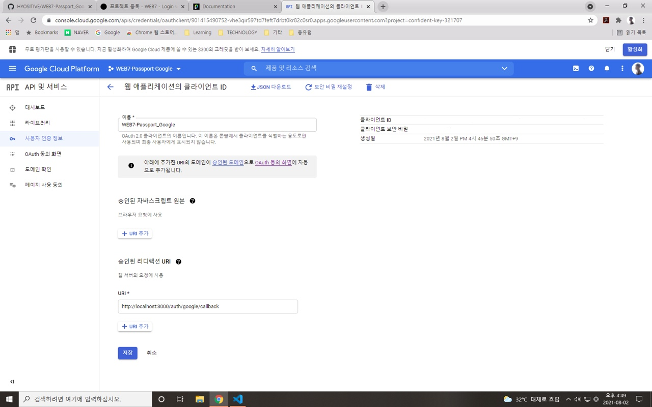 다음으로는 Google Cloud Platform에 방문 해 'WEB7-Passport-Google'이라는 이름의 프로젝트를 생성했다. 이후 사용자 인증 정보(Credentials) 탭에서 클라이언트 ID와 클라이언트 보안 비밀(Client Secret)을 발급받고, 로컬 프로젝트 폴더에 config 폴더를 생성 해 인증 정보를 저장했다. 또, 구글 콘솔에서 Google+ API(로그인 기능을 위한 API)를 해당 프로젝트에 허용 해 주었다. 이 부분이 바로 특정 프로젝트가 구글의 어떠한 기능을 사용할 지(Scope)를 지정하는 내용이었는데, 로그인을 위한 API 말고도 캘린더, G메일, 드라이브, 유튜브 등 다양한 기능들을 제공하는 API 라이브러리들이 존재했다. 이번 강의에서는 로그인 기능만 구현했지만, 이후 실제로 웹 서비스를 만든다면, 다양한 강력한 기능들을 사용할 수 있을 것 같았다.