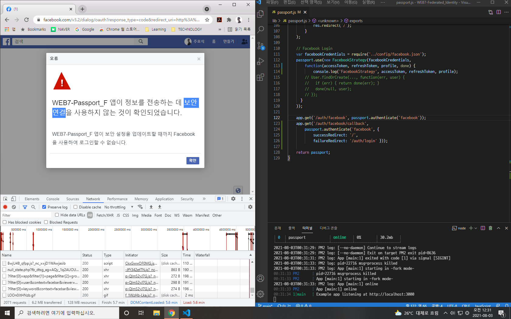 API 설정을 완료한 이후, 우리 서비스가 페이스북으로부터 정보를 잘 받아오는지 테스트 해 보았는데, 생각지도 못한 문제가 발생했다. 2018년에 제작 된 강의 영상에서는 큰 문제가 없었는데, 그 사이에 페이스북에서 보안 정책을 더 깐깐하게 수정한 탓에 페이스북 API를 활용하는 모든 웹 서비스는 반드시 https로 접속해야 했던 것이다. 나는 실제 배포가 아닌 학습과 개발 목적이었기 때문에 localhost 환경에서 테스트하고 있었는데, 이 때문에 페이스북 인증이 정상적으로 실행되지 않았다.