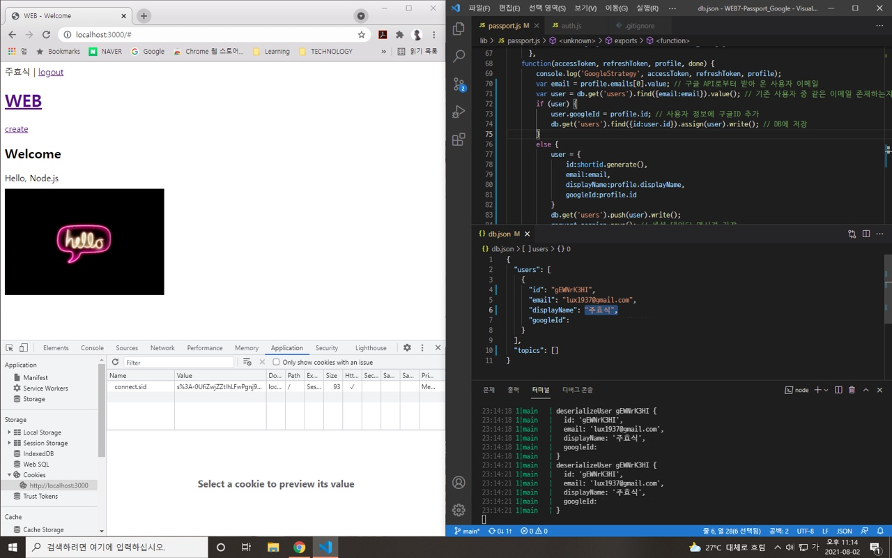 이후, 구글로부터 받아 온 데이터를 DB에 저장하는 코드를 작성하고, 실질적인 로그인이 이루어지도록 인증 코드를 조금 수정했다. 또, 일반적으로 상용 웹 서비스는 로컬 로그인과 소셜 로그인을 모두 지원하기 때문에, 이를 염두에 둔 작업도 진행했다. 같은 이메일을 사용하는 사용자일 경우, 로컬 전략, 구글 전략의 다른 방식으로 로그인하더라도 같은 사용자로 취급했고, 데이터베이스 상에서도 한 명의 사용자 데이터로 관리했다. 실제 웹 서비스로 사용하기 위해서는 아직 보완해야 할 부분들이 많았지만, 기능 구현을 학습하는 것이 목적이었기 때문에 서비스를 완벽하게 구축하지는 않았다.