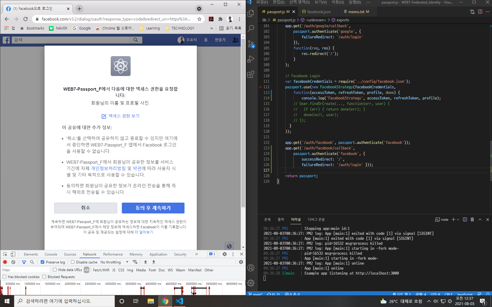 페이스북 인증도 구글 인증과 크게 다르지 않았다. 우선 npm을 통해 프로젝트에 passport-facebook 패키지를 설치했고, Google과 마찬가지로 passport의 가이드를 따라 페이스북 인증을 위한 코드를 추가했다. 다음으로 Facebook 개발자 도구에 접속해 'WEB7-Passport_F'라는 이름의 프로젝트를 생성했다. (페이스북에서는 사용자들이 개발하는 서비스에 Facebook과 같은 키워드를 사용하지 못하도록 설정 해 두었는데, 이후 구현 과정에서도 느꼈지만 구글보다 조금 깐깐하다는 생각이 들었다.) 이후 앱 ID, 앱 시크릿 코드를 발급받아 마찬가지로 로컬 프로젝트 폴더에 인증 정보를 저장했다.