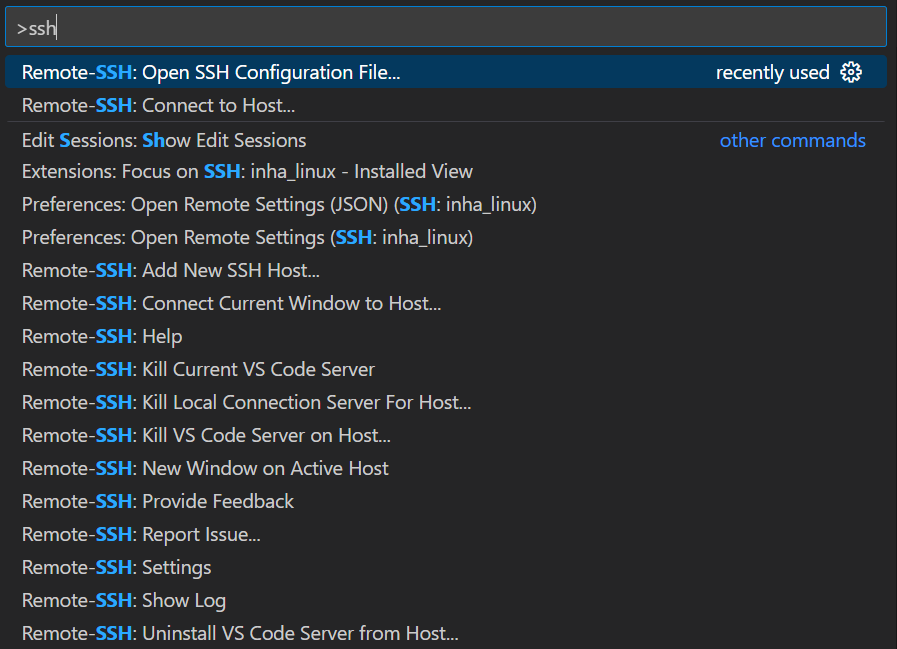 위처럼, Remote-SSH에서 제공하는 다양한 명령어가 있는 것을 확인할 수 있었다.