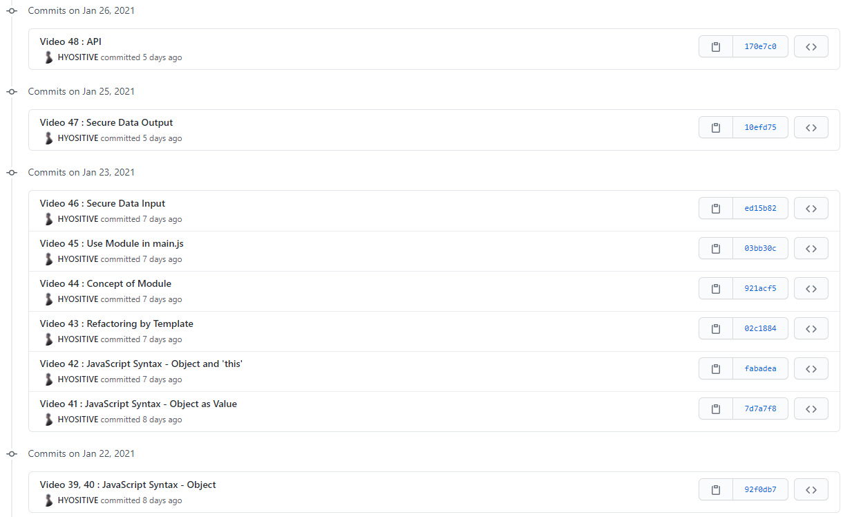 본격적인 공부 재개에 앞서 공부 환경에 변화를 주었다. 우선, 실습 환경을 구름IDE에서 Visual Studio Code로 바꾸었다. 프로그램 크기가 가벼워 사이버지식정보방에서 사용하기에도 무리가 없고, 현업에서 많이 사용하고 있으며, 구름IDE의 불편함을 해소할 수 있었기 때문이다. 이와 동시에, Github에 새로운 저장소를 생성해 이전에 구름IDE에 저장되어 있던 파일들을 모두 이전하고, Visual Studio Code의 Source Control 기능으로 Git을 활용해 Github 저장소와 연동하는 작업도 진행했다. 이전 WEBn 강의를 학습했을 때에는 Git 사용에 익숙치 않아 단순히 코드를 통째로 저장하기만 하고 버전 관리 기능을 아예 활용하지 못했는데, 환경의 변화로 버전 관리 기능을 제대로 활용할 수 있었다. 강의를 학습하며 코드를 수정할 때마다 수정 내용에 대한 Comment와 함께 Commit을 진행했고, 하루의 학습이 모두 끝나면 Push해 Github 저장소에 기록했다.
