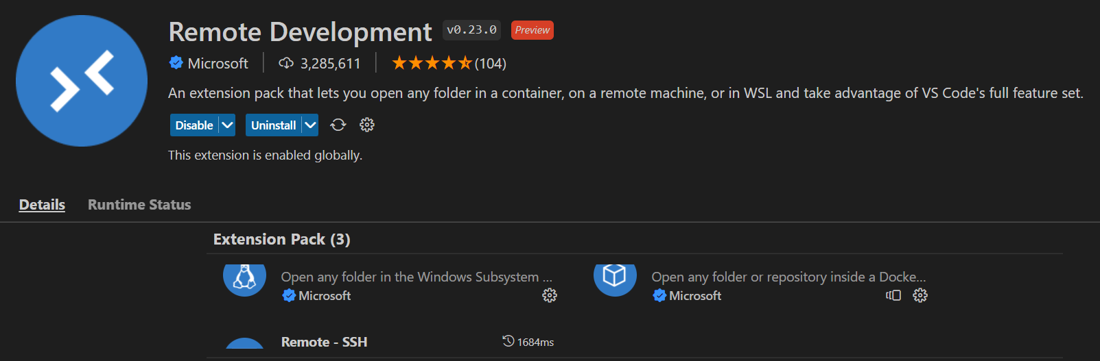 (Remote Development는 WSL, Remote - SSH, Dev Containers 3개의 익스텐션이 포함된 패키지로, 다른 패키지가 필요하지 않은 경우에는 'Remote - SSH' 익스텐션만 설치해도 된다.)